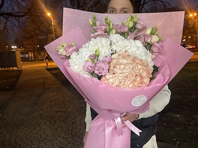 Букет из гортензии, Эустом и роз