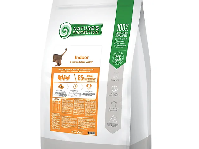 Nature's Protection Indoor з мясом птиці для дорослих хатніх котів від 1 року та літніх вихованців це повнораціонний і збалансований сухий корм супер преміум класу з джерелом протеїну та сировини найвищої якості. Корм містить інгредієнти, які ідеально підходять для забезпечення хатніх кішок необхідною кількістю калорій, вітамінів і мінералів. <br> <br>Основним джерелом білка цього сухого котячого корму є птиця. Це високоякісний поживний білок, наповнений основними поживними речовинами, які сприяють зміцненню здоровя. Збалансований склад цього сухого корму містить натуральні добавки, зокрема MicroZeoGen, що допомагає виводити токсини з організму та підтримувати здорову імунну систему. Також корм збагачений Омега-3 і Омега-6 жирними кислотами, необхідними для здоров'я шкіри та шерсті. Моно- та поліненасичені жирні кислоти підтримують імунну систему, а насичені жирні кислоти забезпечують необхідною енергією. Цей сухий корм для котів також багатий на клітковину, розроблений для того, щоб допомогти контролювати утворення шерстяних грудочок, сприяти здоровому травленню та забезпечувати добре загальне самопочуття котів. Усі інгредієнти ретельно відібрані ветеринарами та дієтологами на основі справжніх потреб вашого вихованця.
