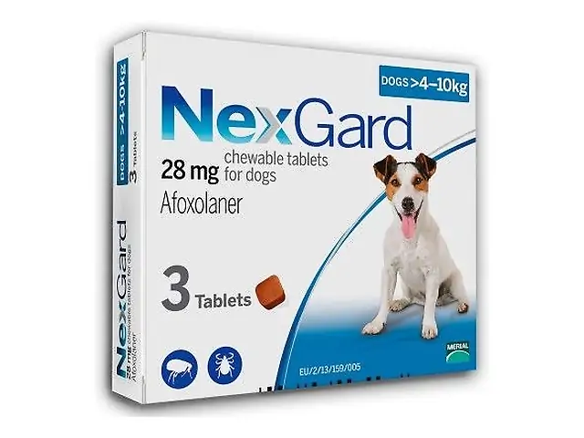 Жувальні таблетки NexGard призначені для профілактики та лікування собак від бліх (Ctenocephalides felis, Ctenocephalides canis) та профілактики зараження іксодовими кліщами (Dermacentor variabilis, Dermacentor reticulatus, Ixodes ricinus, Ixodes scapularis, Rhipicephalus sanguineus), Amblyomma americanum, Hae. Препарат можна застосовувати також при лікуванні блошиного алергічного дерматиту, можливе використання комплексної терапії. <br> <br>Це дозування (28 мг) призначене для дорослих собак вагою 4-10 кг, а також для цуценят всіх порід старше 8 тижнів та вагою не менше 4 кг. Якщо ваш вихованець має масу тіла менше 4 кг або більше 10 кг, використовуйте таблетки іншого відповідного дозування. <br> <br>Діюча речовина таблеток НЕКСГАРД афоксоланер, інсектоакарицид групи ізоксазоліну. Він блокує ГАМК-залежні рецептори членистоногих, що призводить до порушення передачі нервових імпульсів, паралічу та загибелі паразитів. Такий вплив препарат чинить тільки на безхребетних та абсолютно безпечний для ссавців, і зокрема для собак. Один прийом NexGard гарантує знищення бліх на тварині протягом 6-8 годин, кліщів протягом 48 годин, а також запобігає повторному зараженню ектопаразитами протягом 4 тижнів.