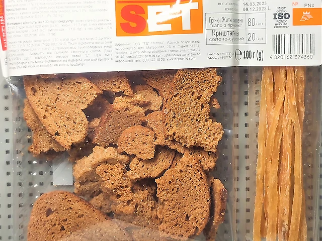 Пропонуємо Вам спробувати морські делікатеси вищого гатунку! <br>Склад набору: Грінки житні "САЛО З ГІРЧИЦЕЮ" -80г. + Рибка Кришталева солено сушена -20г.