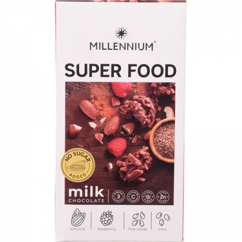 Цукерки Millennium 80 г Super Food молочні з мигдалем, малиною, льоном та чіа