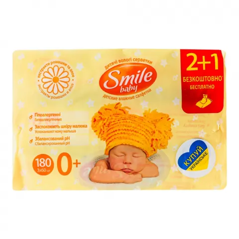 Серветки вологі Смайл Baby 60 шт. 2+1 Екстракт ромашки та алое мультипак